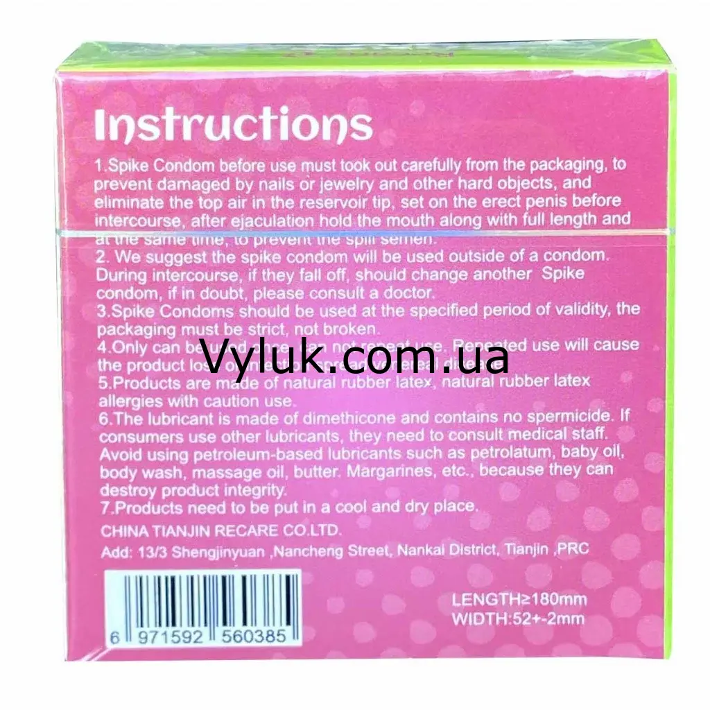 - Зелені шипики: Один ряд маленьких зелених шипиків обручує презерватив, створюючи додаткову стимуляцію та посилюючи відчуття від дотиків.